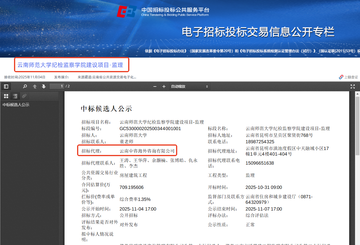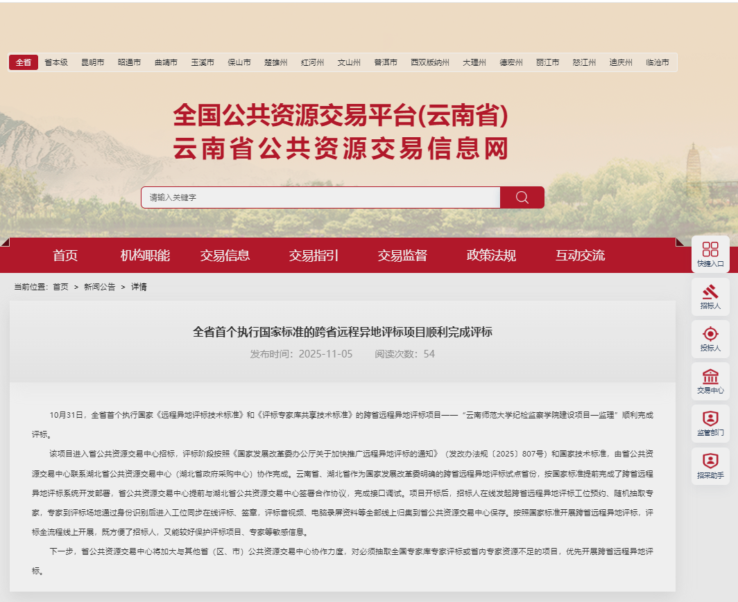 2025年10月31日,“云南師范大學(xué)紀(jì)檢監(jiān)察學(xué)院建設(shè)項(xiàng)目—監(jiān)理”評(píng)標(biāo)工作圓滿完成。此項(xiàng)目不僅是云南省公共資源交易領(lǐng)域的重要里程碑,更標(biāo)志著全省首個(gè)嚴(yán)格依據(jù)國(guó)家《遠(yuǎn)程異地評(píng)標(biāo)技術(shù)標(biāo)準(zhǔn)》與《評(píng)標(biāo)專家?guī)旃蚕砑夹g(shù)標(biāo)準(zhǔn)》實(shí)施的跨省遠(yuǎn)程異地評(píng)標(biāo)項(xiàng)目正式落地。作為該項(xiàng)目招標(biāo)代理機(jī)構(gòu),云南中咨海外咨詢有限公司以專業(yè)實(shí)力與創(chuàng)新精神,助力云南公共資源交易邁入標(biāo)準(zhǔn)化、協(xié)同化、數(shù)字化的新階段。